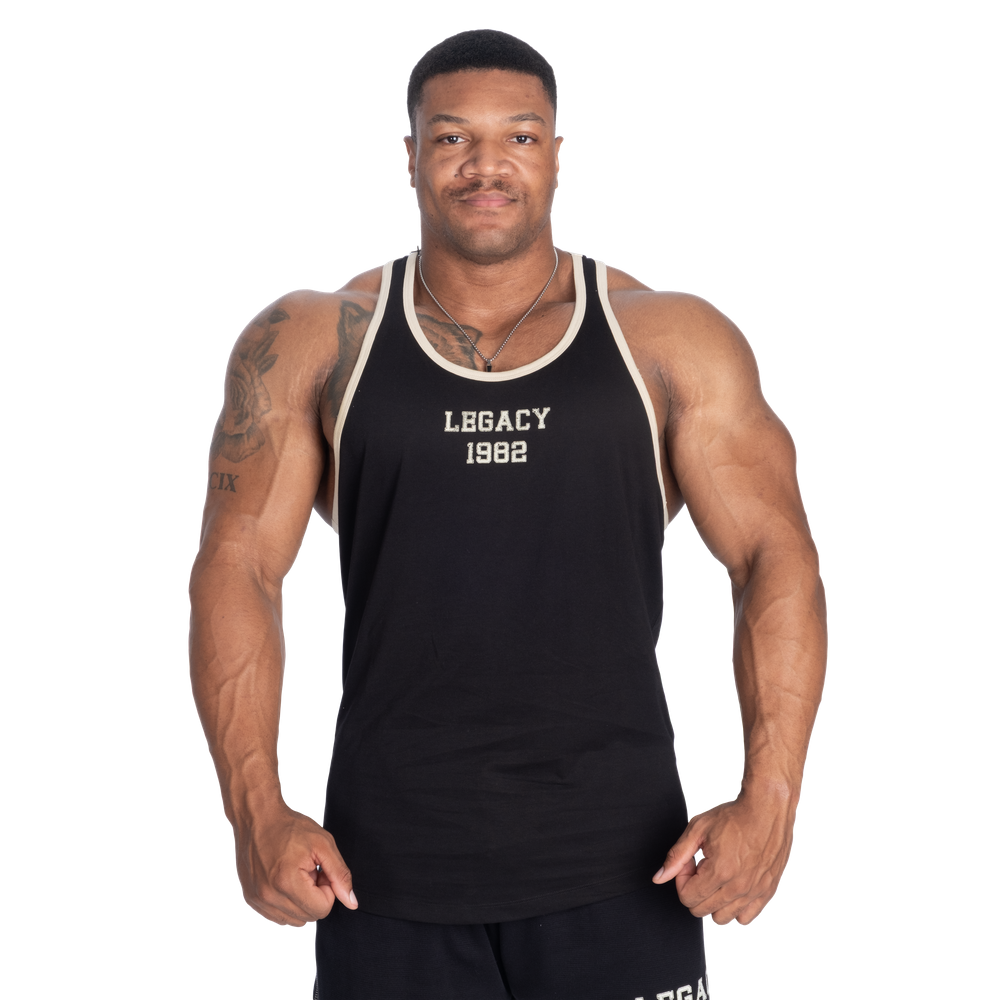 The soft poly/cotton blend offers breathability and comfort, while the open T-back design allows full range of motion. Contrast piping sharpens the look, and the centered Legacy print anchors the piece in Better Bodies heritage.